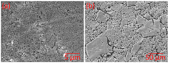 The SEM micrographs of the samples, recorded with magnifications of 10 kX and 1 kX, respectively, are shown in Figure 3.