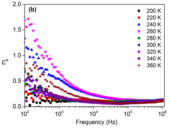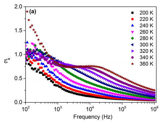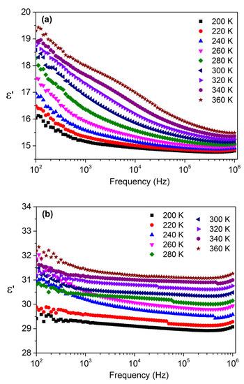 The frequency dependence of the dielectric constant, ε′, of the studied samples, at different temperatures, in the frequency range of 100 Hz to 1 MHz is shown in Figure 4.