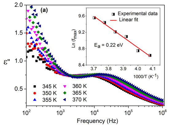 To better understand the relaxation phenomenon, the frequency dependence of the dielectric losses of the α-BiNbO4 sample, at temperatures between 345 and 370 K, is shown in Figure 6a. As the temperature increases, the position of the peaks shifts to higher frequencies. The activation energy for the relaxation mechanism, Ea, can be obtained from the values of the frequency where ε″ is maximum, fmax, as a function of the temperature. Assuming that the process is activated by temperature [23],