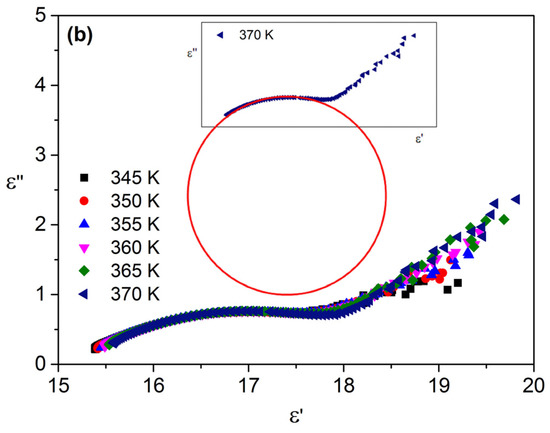 The Nyquist plot, for the pure α-BiNbO4 sample, is depicted in Figure 6b. The relaxation mechanism for each temperature has a shape of a decentred semicircle, which is a profile that confirms that the simple Debye model is inappropriate to depict the relaxation phenomena. If the Nyquist plot is given by a semicircle centred in the ε′ axis, the Debye model is suitable to describe the relaxation phenomenon. However, if the relaxation process has a shape of a decentred symmetric semicircle, with the centre located below the ε′ axis, the Debye model should be replaced by the Cole–Cole model. On the other hand, if the semicircle is asymmetric in relation to the imaginary axis, the Cole–Davidson model is the most suitable one [29,30]. As the inset highlights, the semicircle is symmetric, having its centre located below the ε′ axis, which indicates that the Cole–Cole model is suitable to study this relaxation phenomenon. The semicircle can be attributed to the contribution of the bulk effect, whereas the straight line, visible at low frequencies, is due to the DC conductivity, σdc, effect [31].