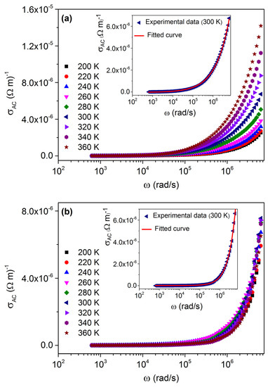 The electrical conductivity spectra were well fitted using Equation (4). Figure 7 insets show this fitting for the temperature of 300 K.