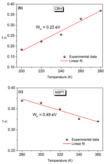 The WH value, 0.49 eV, was obtained from the slope of (1−n) versus temperature, represented in Figure 8c.