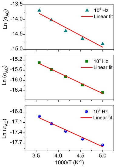The AC conductivity, σac, was extracted from the dielectric data using Equation (3) [32]: