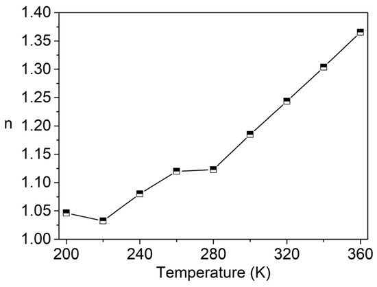 The frequency exponent n for the β-BiNbO4 sample, obtained from the fitting of Equation (4), was plotted as a function of temperature, as shown in Figure 10. As one can see, n is superior to 1 in the temperature range studied. The AC conductivity mechanism of this sample could be attributed to the motion of mobile charge carriers from site to site with quantum mechanical tunnelling between asymmetric double-well potentials if the exponent n was temperature-independent or increased slightly with temperature [1,20,37]. As seen in Figure 10, the increase in the exponent n with temperature is substantial, which means that the motion involves localised hopping between neighbouring sites [38]. The type of conduction process was also identified in other ABO4 oxides [39,40].