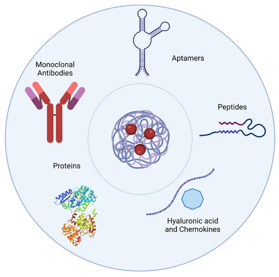 Types of targeting molecules available for PNPs functionalization. Different kinds of molecules can be used for the targeted delivery of nanoparticles. The main classes are monoclonal antibodies, oligonucleotide aptamers and other molecules such as like proteins or chemokines. Created with BioRender.com (accessed on 2 December 2022).