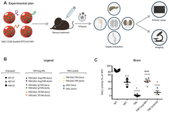 An example of targeting PNPs functionalized with different peptides for the targeting and crossing of the BBB. In this work, the authors showed the functionalization of PLGA nanoparticles with different peptides that are able to cross the BBB and performed an optimized enzyme replacement therapy in vivo. (A) Scheme of the experiment. Specific mice with Krabbe disease (TWI) were treated with targeted NPs (GALC Ang2 NPs, GALC g7 NPs, or GALC Tf2 NPs), nontargeted NPs (GALC CLEA NPs), or with the free enzime rm-GALC (GALC). After four hours mice were euthanized, and GALC activity was assayed in extracted brain, sciatic nerves, spinal cord, kidneys, and liver by HMU-βGal assay. (B) Legend. (C) Brain GALC activity calculated for each animals. (From Del Grosso et al.) [81]. © The Authors, some rights reserved; exclusive licensee AAAS. Distributed under a Creative Commons Attribution NonCommercial License 4.0 (CC BY-NC) http://creativecommons.org/licenses/by-nc/4.0/ (accessed on 2 December 2022). *** p < 0.001 HET versus WT **** p < 0.0001 TWI, TWI targ-NPs, and TWI control versus WT # p < 0.05 TWI control versus TWI #### p < 0.0001 TWI-TARG-NPs versus TWI + p < 0.05 TWI versus HET.
