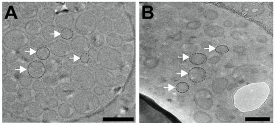 Cryogenic Transmission Electron Micrographs (Cryo-EM) of (A) liposomes without chloroquine, and (B) liposomes encapsulating chloroquine. Black dashed outlines and white arrows highlighted some liposomes as a guide to the eye. Scale bars: 200 nm.