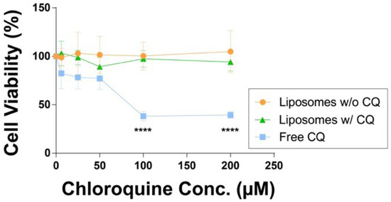 Cell viability of RAW 264.7 macrophages exposed to liposomes w/o chloroquine (CQ), liposomes w/chloroquine, and free chloroquine (n = 5) for 8 h. Data points represent mean +/− SD. Statistical differences were determined using a two-way ANOVA and Tukey’s multiple comparisons (**** p < 0.0001).