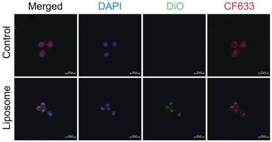 RAW 264.7 macrophages were incubated with DiO-liposomes (green) for 4 h before being washed, fixed, permeabilized, and stained with DAPI (blue) for nuclei visualization and phalloidin CF6333 (red) for F-actin visualization. There is a visible DiO signal inside cells that were treated with DiO-liposomes, with an expected near-background signal in the untreated controls. The scale bars indicate 20 µm.