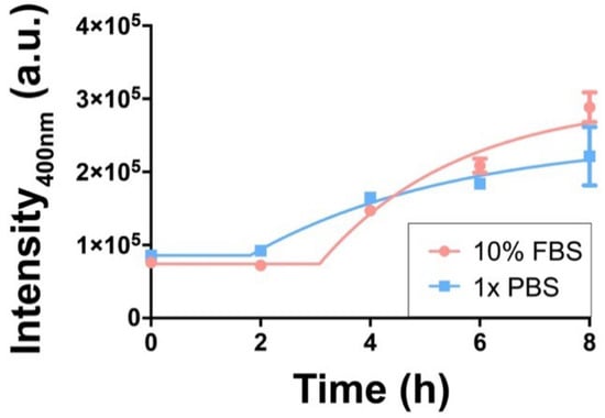Given the observed superior cell viability levels for macrophages during liposomal chloroquine exposure, we wondered about the potential mechanism. We hypothesized that chloroquine release from liposomes was slow, resulting in safer cellular drug delivery over time compared to free chloroquine, which may diffuse rapidly across cellular membranes to cause cytotoxic effects. To test this hypothesis, we quantified the chloroquine release kinetics from liposomes based on a fluorescence spectroscopy in vitro assay at 37 °C to mimic physiological conditions. Chloroquine encapsulating liposomes were dispersed in two physiologically relevant aqueous buffers that are commonly used in cell culture studies: (i) 1x PBS, and (ii) 1x PBS containing 10% FBS (fetal bovine serum). Free chloroquine is a strongly fluorescent compound due to the quinine molecular structure (ex. 320 nm/em. 400 nm; Figure S5) [19,20,21]. Our spectroscopic studies indicated that chloroquine fluorescence was quenched upon liposome encapsulation. This finding is likely due to self-quenching, given the high local chloroquine concentration within liposomes. However, upon release of chloroquine from liposomes, we detected an increase in fluorescence intensity, likely due to reduced fluorescence self-quenching. Based on these photophysical observations, we tracked the chloroquine release kinetics from liposomes by measuring chloroquine fluorescence intensity over time (Figure 4).