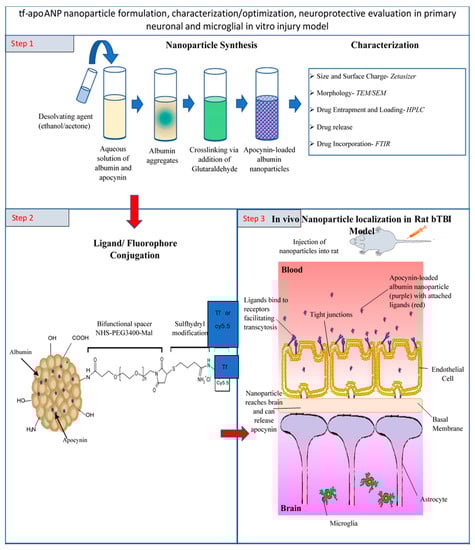 A schematic illustration of apocynin-loaded, TfR-targeted albumin nanoparticle (tf-apoANP) synthesis using the cross-linking method and characterization. Covalent conjugation of transferrin and FITC to BSA nanoparticles. Ligand-conjugated apoANPs can enter the CNS through the impaired BBB and BBB endothelium via receptor-mediated transcytosis.