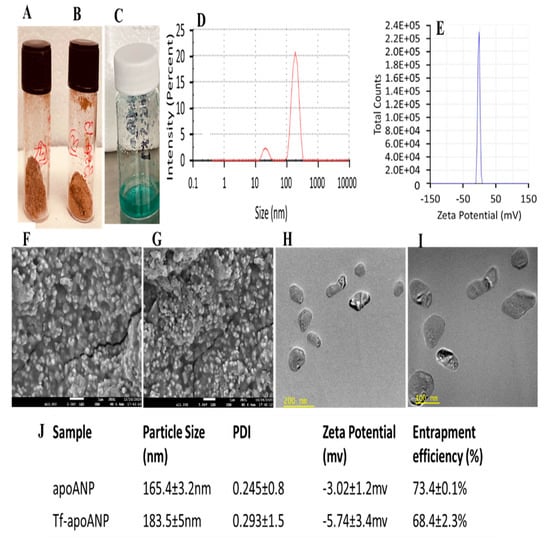 Characterization of apoANPs and tf-apoANPs. Freeze-dried samples of (A) apoANPs, (B) tf-apoANPs and (C) Cy5.5-conjugated tf-apoANPs. Particle sizes of (D) apoANPs and (E) tf-apoANPs. Representative SEM images of (F) apoANPs (magnification = 25,000×) and (G) tf-apoANPs (magnification = 30,000×). Representative TEM images of (H) apoANPs (magnification = 26,000×) and (I) tf-apoANPs (magnification = 26,000×). (J) Table listing the particle size, PDI, zeta potential, and entrapment efficiency values of apoANPs and tf-apoANPs (data expressed as means ± SD (n = 3), statistical significance (p < 0.05)). PDI: Polydispersity index.