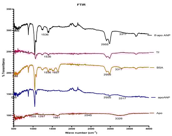 We obtained the FTIR spectra of BSA, transferrin, apocynin, apoANPs, and tf-apoANPs (Figure 3). The FTIR spectra of BSA displayed several distinguishing peaks at 3317 cm−1 arising from amine groups (N-H stretching vibration); a peak in the amide bond at 1657 cm−1 was attributed to C=O stretching vibration (amide I band), with another attributed to mixed vibrations of N-H bending and C-N stretching (amide II band) at 1536 cm−1 [53].