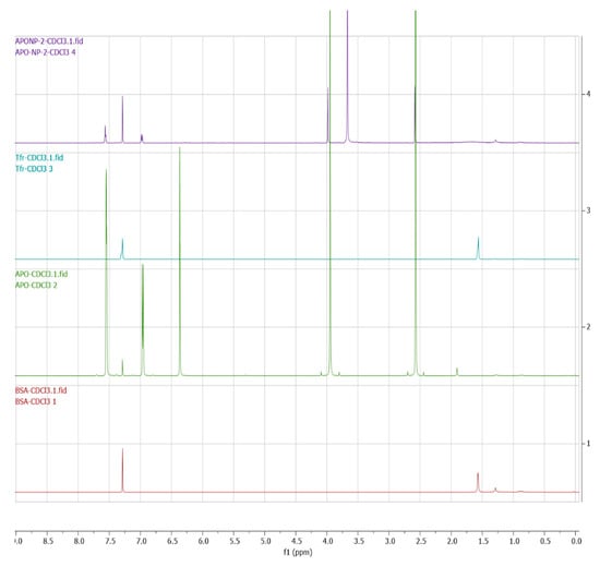 The BSA, transferrin, apocycnin, and tfMANP conjugates were characterized via proton nuclear magnetic resonance spectroscopy (1H-NMR) to confirm the successful synthesis. The 1H-NMR analyses were recorded on a Bruker DRX-600 Avance III spectrometer with deuterated chloroform (CDCl3) as the solvent at room temperature. The samples (1 mg of each) were dissolved in 1 mL of CDCl3 and the products were assessed using an NMR spectrometer. The results showed that there was no specific peak of apocynin in the nanoparticles, which confirmed that there was no chemical interaction and only a physical mixture of nanoparticles and BSA. However, there was a peak at 3.8, which confirmed the ligand’s conjugation to the nanoparticles, corroborating the FTIR results (Figure 4).