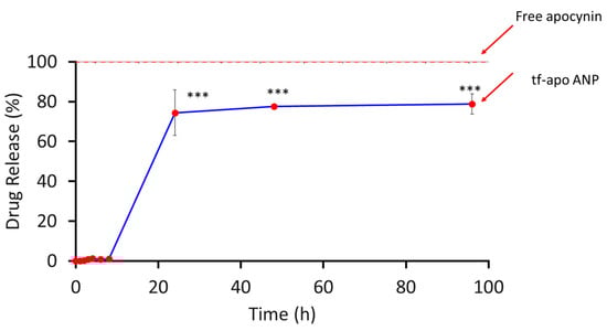 Drug release profile of apocynin-loaded albumin nanoparticles. The values shown here represent the SD (n = 3). A two-way ANOVA and multiple-comparison analysis were performed; *** p < 0.001.