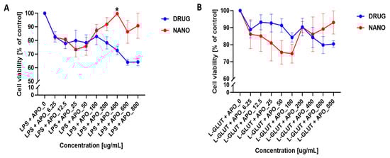 Cell viability assessment of apocynin and nanoparticle–apocynin conjugate treatments. Percentages of viable neuronal cells after treatment with increasing concentrations of apocynin alone (DRUG) or the nanoparticle–apocynin conjugate (NANO) for 48 h when combined with (A) 100 ng/mL lipopolysaccharide or (B) 100 µM L-glutamic acid are shown. The data were analyzed using a two-way ANOVA with Šídák’s multiple comparisons test. The results are presented as mean values (±SEM, N = 4 experiments). Significant difference are indicated by * p ≤ 0.05.