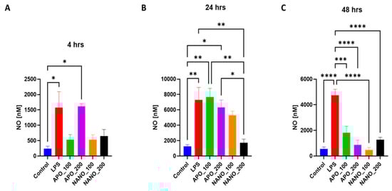 Measurement of NO production in injured neurons treated with the nanoparticle–apocynin conjugate. The primary cortical neurons were treated with either the PBS vehicle (control), 100 ng/mL of lipopolysaccharide, 100 mM of apocynin (APO_100), 200 mM of apocynin (APO_200), nanoparticles conjugated with 100 mM of apocynin (NANO_100), or nanoparticles conjugated with 200 mM of apocynin (NANO_200). The amounts of NO produced were measured at (A) 4, (B) 24, and (C) 48 h. The data were analyzed using a one-way ANOVA with Tukey’s multiple comparisons test. The results are presented as mean values (± SEM, N = 4 experiments). Significant differences are indicated by * p ≤ 0.05, ** p ≤ 0.01, *** p ≤ 0.001, and **** p ≤ 0.0001.