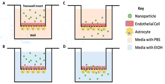 Cartoon depicting the transwell scheme. Primary rat brain microvascular endothelial cells were cultured on the 3 μm pore transwell insert while astrocytes were cultured underneath the insert. Nanoparticles were suspended in the basal medium (A) or a medium containing 20 mM of EtOH (B) and added to the transwell insert. (C,D) The movement of nanoparticles across this barrier, towards the well, was monitored over time.