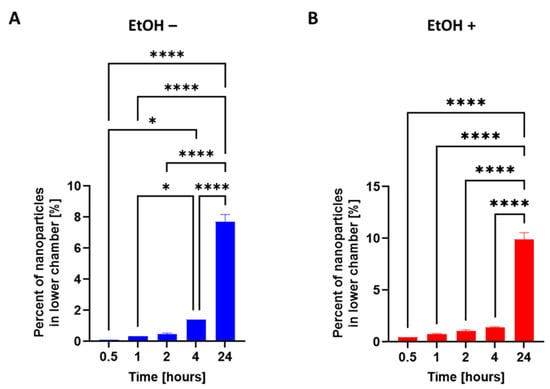 Nanoparticle migration through an in vitro model of the blood–brain barrier. The apical side of the model was treated with either the (A) PBS vehicle (EtOH −) or (B) 10 mM of ethanol (EtOH +) for 24 h, after which time a suspension of fluorescently tagged nanoparticles was added. The migration of nanoparticles was observed at 0.5, 1, 2, 4, and 24 h. The data were analyzed using a one-way ANOVA with Tukey’s multiple comparisons test. The results are presented as mean values (±SEM, N = 4 individual models). Significant differences are indicated by * p ≤ 0.05 and **** p ≤ 0.0001.