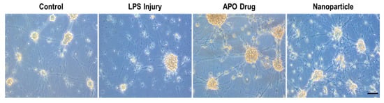 Effects of nanoparticle–apocynin conjugate treatment of injured neurons. Representative images of primary rat cortical neurons in the medium (control), after 48 h in 100 ng/mL of lipopolysaccharides (LPS injury) or 100 mM of apocynin (APO Drug), or in the nanoparticle–apocynin conjugate (nanoparticles) after 24 h of exposure to 100 ng/mL of lipopolysaccharides. The black bar represents 100 μm (20× magnification).
