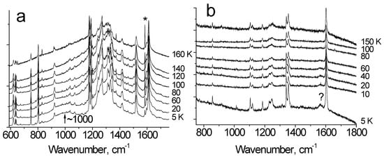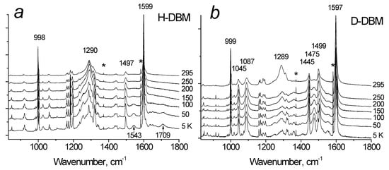 Figure 2a shows the Raman spectra of H-DBM at various temperatures. The spectra contain two striking features, namely, the bands at 1543 and 1709 cm−1, which are intense at low temperatures but practically disappear at room temperature. In deuterated D-DBM crystals (Figure 2b) both of these modes are not observed at all, but two new groups of bands appear: in the region of 1000–1100 and 1400–1550 cm−1. The dependence of their intensities on temperature significantly differs from that observed in H-DBM: they do not decrease to zero with increasing temperature, but only slightly begin to decrease at T > ~200 K.