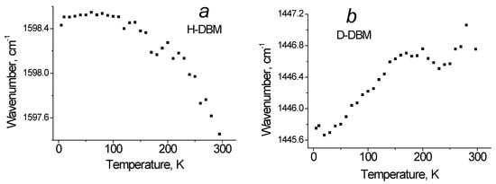 (a,b) Temperature dependence of the position of 1599 cm−1 in H-DBM (a) and the 1445 cm−1 D-DBM (b) band peak of the C=O stretching vibration of the enol cycle.