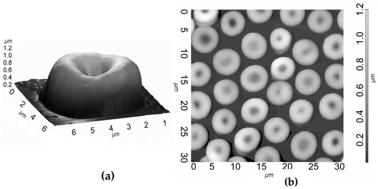 In Figure 1, we show the AFM image of a mouse erythrocyte, which in blood usually has the shape of a discocyte (a), and a typical scanning area of 30 × 30 μm2 (b).