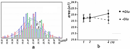 Histogram of the distribution of the area of the AFM image of the erythrocytes of mice after their incubation 1 h (“1”-blue), 2 h (“2”-green), and 3 h (“3”-red) in the absence of glucose and approximation by a normal distribution–(a) Changes in the area of the AFM image of erythrocytes (mean) of mice during their incubation in the presence of glucose ● (+) and glucose absence ■ (−). A 95% confidence interval is shown-(b).
