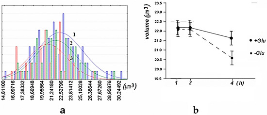 Histograms of the distribution of the volumes of the AFM image of the erythrocytes of mice after their incubation 1 h: blue–“1”, 2 h: green–“2” and 3 h: red–“3” in the absence of glucose and approximation by normal distribution-(a) Changes in the volume of the AFM image of erythrocytes (average) of mice during their incubation in the presence of glucose ● (+) and its absence ■ (−). A 95% confidence interval is shown-(b).