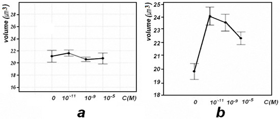 With the introduction of phenosan K into the suspension of erythrocytes in vitro, insignificant changes in the volumetric parameters of AFM images of erythrocytes were observed (Figure 4a). These facts indicate that there are no effects on the osmotic state of erythrocytes. With the introduction of Ihfan-10 into the suspension of erythrocytes in the in vitro system, starting from a low concentration of 10−11 M, an increase in the volume of erythrocytes was observed (Figure 4b). The data on changes in the architectonics of erythrocytes with the introduction of Ihfan-10 in vitro do not contradict the data obtained by electron microscopy and spin labels. For example, it was previously shown that Ihfan-10 in vitro, at a concentration of 10−4 M, causes a change in the shape of discocytes and, within a certain time (hours), converts them into the form of stomatocytes and echinocytes [13,14].