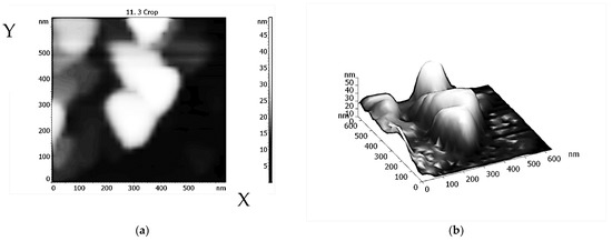 In the AFM study, we used the scanning probe AFM microscope SOLVER P47 SMENA10 (Adm. Distr. Zelenograd of Moscow, Russia) at a frequency of 150 kHz, using an NSG30 cantilever with a radius of curvature of 10 nm, a resonance frequency of 300 kHz, and a force constant of 22–100 N/m in the tapping mode. Polished quartz with a roughness Ra = 6 nm was used as a substrate.
