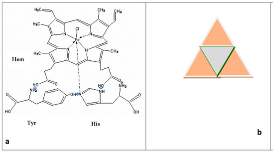 One of the possible schemes for the formation of triangular complexes based on the {Hem + Tyr + His} system (and then prisms) due to H-bonds (NH•••O or N•••HO) [15,16,17,18] can be seen in Figure 6a,b. The combination of individual triangles ({Hem·Tyr·His} complex, Figure 6a) into triangular structures like Sierpinski triangular motifs [23] (Figure 6b) due to H-bonds, and then π–π intermolecular interplanar interactions, can lead to the formation of triangular prisms (Figure 5).