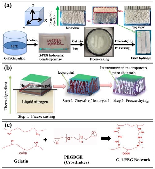 Schematic representation of the synthesis of macroporous Gel-PEG hydrogel: (a) simplified form of hydrogel preparation process, (b) formation of macroporous interconnected channels along the direction of freezing and (c) proposed mechanism showing the Gel-PEG stable network formation.