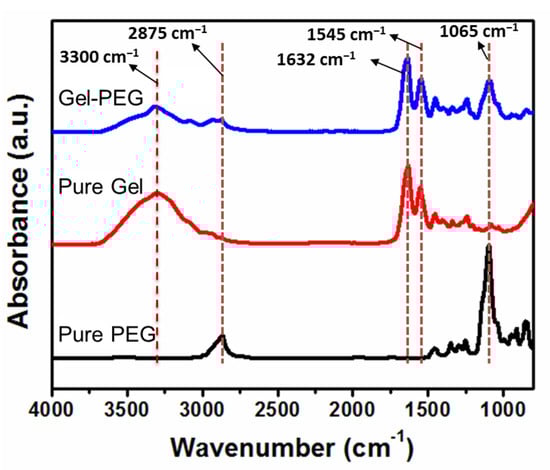 FTIR analysis was performed using pure starting materials and hydrogel (washed several times with distilled water at 37 °C and freeze-dried) to characterize the chemical compositions of hydrogel, as shown in Figure 2. The FTIR spectrum of pure functionalized PEG depicted a broad peak at 2875 cm−1 related to a C-H stretching vibration. The characteristic intense peak observed at 1096 cm−1 is due to C-O stretching (ether bond C-O-C). The pure gelatin showed absorption bands at 3300 cm−1 and 2930 cm−1, assigned to amide A and B, respectively, mainly associated with the stretching vibration of –NH groups. The characteristic peaks observed at 1632 cm−1, 1545 cm−1 and 1242 cm−1 correspond to amide I (due to C=O stretching vibrations), amide II (due to –NH bending vibrations and C-N stretching vibrations) and amide III (due to vibrations in plane of C-N and N-H groups bound amide or vibrations of CH2 groups of glycine), respectively [8,37]. The peaks at 1081 cm−1 and 1033 cm−1 indicated a C-O stretching vibration. As shown in the spectra of Gel-PEG hydrogel (shown in the vertical dotted line in Figure 2), all characteristic peaks of individual components were observed in the hydrogel, indicating the formation of a hybrid hydrogel. The intense peak at 1065 cm−1 of the hydrogel was due to the incorporation and interaction of functionalized PEG with gelatin and revealed the presence of PEG in the final product.
