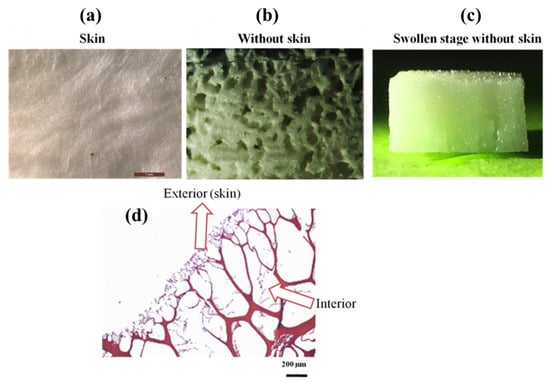 Skin formation during freeze-drying: (a,b) optical microscopy visualization of hydrogel in dried condition with and without skin, (c) hydrogel in swollen stage without skin and (d) staining microscopic image of the hydrogel in wet condition showing the thin skin comprising closed pores as well as an interior interconnected open porous structure.