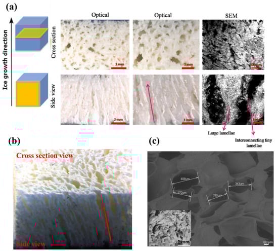The macro and microstructures of the Gel-PEG hydrogel without skin were investigated using optical and scanning electron microscopes, as shown in Figure 4a–c. It was obvious that the hydrogel showed anisotropic pore structures. The irregular spherical pore morphology was observed in the perpendicular direction of freezing (cross-section) with pore sizes ranging from 20–450 µm (Figure 4b). The macroporous large channels were visible in the parallel direction of freezing (side view). These void channels were connected by large-area lamellae, which were composed of micropores. These micropores on the lamellae and macropores collectively constituted the hierarchical porous architecture. Interestingly, the large lamellae were not isolated but they were interconnected with thin lamella bridges. The distance between lamellae was several tens to more than 200 µm.