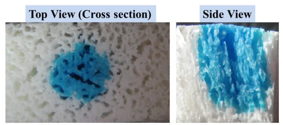 These two distinct pore morphologies, namely, spherical (perpendicular, cross-section view) and lamella (parallel, side view) morphologies are attributed to the anisotropic mass transport phenomenon of the Gel-PEG hybrid hydrogel. Figure 5 depicts the anisotropic dye diffusion through the hydrogel on a macroscopic scale. The diffusion of dye was visualized by monitoring the distance it traveled through the hydrogel. When an aqueous solution of methylene blue was dropped on the hydrogel surface, it diffused preferentially through the large channels (side view).
