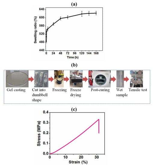Water uptake and tensile property of the hydrogel: (a) swelling ratio of hydrogel incubated in distilled water at 37 °C, (b) sample preparation steps for tensile test and (c) representative tensile stress-strain curve of the hydrogel.
