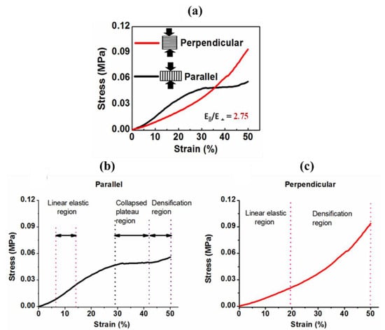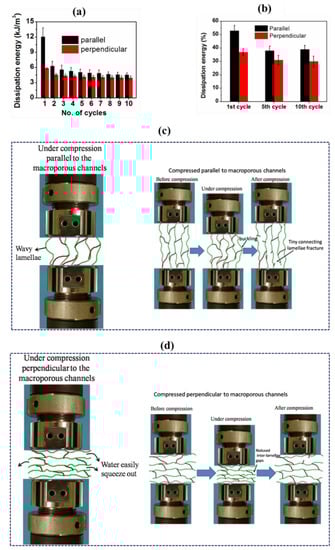 It is noted that when compressed parallel to the macroporous channels, the calculated dissipation energy and percentage dissipation energy were slightly higher compared to those of a perpendicular direction. The schematic illustrations of the sample undergoing compression parallel and perpendicular to the macroporous channels are displayed in Figure 9c,d. During compression in a parallel direction, interconnected large lamellae became more wavy, less oriented and caused some microfractures (Figure 9c). Moreover, entrapped water might not easily squeeze out of the sample, resulting in more frictional energy being generated (also dissipated energy due to polymer viscoelasticity). However, during unloading, the lamellae recovered their alignment and orientation. This frictional energy might originate from two distinct paths, forming a hysteresis loop. We postulated that this pronounced buckling and bending of lamellae and more frictional energy due to the migration of more entrapped water might contribute to a larger hysteresis loop area when compressed in a parallel direction. In contrast, during compression in a perpendicular direction, water might easily squeeze out through the macroporous channels, making more available space for the densification of the adjacent lamellae, resulting in fewer microfractures (Figure 9d). These reduced microfractures, polymer deformation and easier water migration within the network might lead to a smaller hysteresis loop area, and, consequently, a lower dissipation energy [4].
