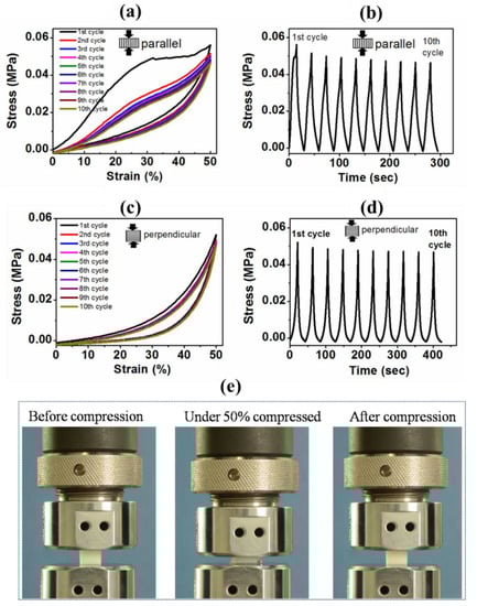 Figure 8c,d shows the stress-time curves resulting from the cyclic loading-unloading and corresponding stress-time curves compressed in a perpendicular direction to the macroporous channels. Stress-strain curves depicted very little variation between the first and second loading curves. However, beyond the second cycle, all subsequent hysteresis loops were superposed, suggesting good reversible behavior. The corresponding stress-time plot also echoed the same scenario (Figure 8d).