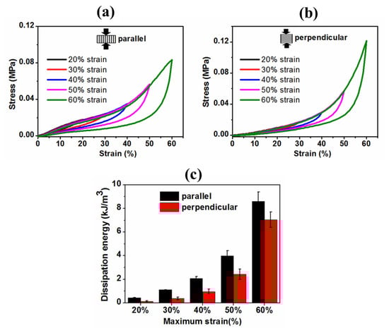 To further confirm the mechanical stability of the hydrogel, we also conducted cyclic loading-unloading experiments directly after each other at different maximum strains (20%, 30%, 40%, 50% and 60%) in both directions, and the hysteresis loops were shown in Figure 10a,b. For both cases, the hysteresis loops area became larger with increasing maximum strain. Moreover, as presented in Figure 10c, the hydrogel showed an exponentially increasing trend of dissipation energies with the increasing maximum strain, suggesting that the hydrogel could be capable of effectively dissipating energy at larger deformation. It is noted here that the slightly higher dissipated energies for parallel compression might be due to the migration of more pressurized water throughout the porous network.