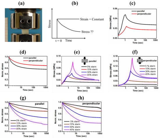 Stress relaxation behaviors of the Gel-PEG hybrid hydrogel: (a) representation of stress relaxation test carried out using rectangular-shaped wet samples by being placed between two impermeable metal plates and suddenly subjected to compression up to 15% strain, (b) subsequently, the strain is held constant, while the stress is recorded as a function of time, (c) stress relaxation behavior of hydrogel is compared compressing in parallel and perpendicular directions, (d) corresponding relative rate of relaxation; stress is normalized by the maximum stress, (e,f) stress relaxation behavior of hydrogel subjected to compression holding at various strain levels (5%, 15%, 30% and 45%) both in parallel and perpendicular directions and (g,h) corresponding relative rates of relaxation (normalized stress vs. time).