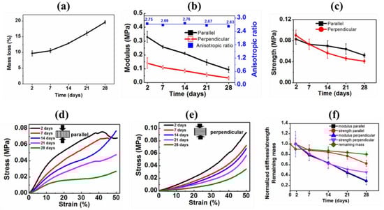 Mass loss (%) and associated mechanical properties of the Gel-PEG hydrogel during hydrolytic degradation in distilled water at 37 °C: (a) mass loss (%) of the hydrogel during hydrolytic degradation, (b) variation of elastic moduli and anisotropic ratio (blue line) of hydrogel over hydrolysis time, (c) variation of strength during hydrolysis time, (d,e) representative stress-strain curves of hydrogel over hydrolysis time compressed parallel and perpendicular to the macroporous channels, respectively, and finally (f) normalized stiffness/strength/remaining mass vs. hydrolysis time.
