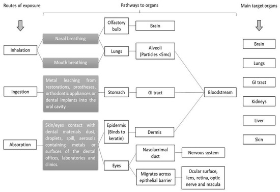 The three primary routes of occupational and nonoccupational exposure to metals in dentistry include (1) inhalation, (2) ingestion, and (3) dermal/ocular exposure. Figure 1 illustrates the possible routes of exposure, pathways to organs, and primary target organs of the human body for metallic elements in the dental environment.