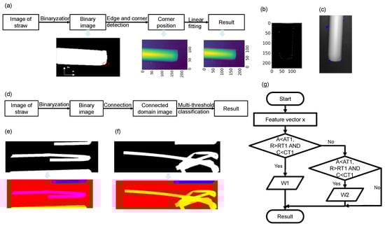 (a) Flowchart for the detection of sealing wrinkle defects of telescopic straws; (b) Corner detection effect diagram with Harris operator; (c) Corner detection effect diagram with Susan operator; (d) Head problem and pressure tube defect detection flowchart; (e) Binary image of straw with head problems and its connected domain labeled effect image; (f) Binary image of straw with pressure tube defects and its connected domain labeled effect image; (g) Multi-threshold classification flowchart.