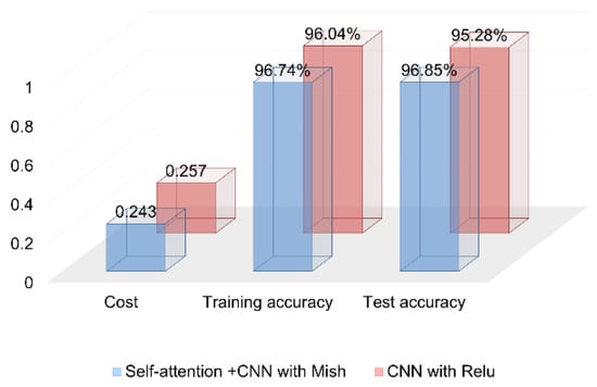 Compared with the Relu function, the Mish function guarantees the smoothness of each point, which makes the gradient descent effect better than Relu. When the value is negative, a smaller negative gradient is allowed to flow in to ensure that the information will not be interrupted, so that the network has better accuracy and generalization ability. In addition, the lower bound can also improve the regularization effect of the network. Based on the above analysis, the self-attention mechanism and Mish function can well make up for some of the shortcomings of traditional CNN. The CNN with the self-attention mechanism and Mish function is proposed to detect real black spot defects. Overall, 557 samples were collected from U-shaped plastic straws, the number of samples with black spot defects was 274, and the number of samples with fake black spot defects was 283. The samples are not large enough for CNN. To avoid over-fitting, the 10-fold cross-validation method [] was adopted. The termination condition of CNN iteration is set to 2500 times, and the learning rate is 0.005. After 2500 iterations of training, the cost is reduced to 0.243, the accuracy of the model’s training set reaches 96.74%, and the test set accuracy reaches 96.85%, as shown in Figure 5. The train accuracy and test accuracy, the CNN with the Mish function, and the self-attention mechanism are higher than the detection results using classical CNN.