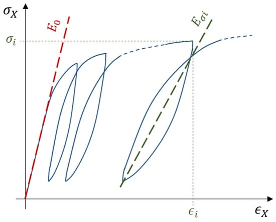 Stress-strain schematic curve (solid blue line) of a repeated progressive tensile loading test and method of determination of the secant moduli Eσi, identified by the dotted lines.