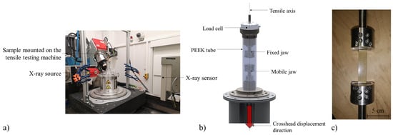 Micro-CT scans were performed using an UltraTom CT scanner developed by the company RX Solutions (France). A Hamamatsu micro focus sealed X-ray tube operates at an amperage range of 0–500 µA and a voltage range of 20–150 kV with a maximum power of 75 W. In this work, a power equal to 15 W was used, with a voltage of 60 kV and an amperage of 250 µA. Images were recorded with a voxel resolution of 15 µm. The dimensions of the scanned zone were 20 mm in width and 4 mm in thickness (total cross-section of the sample), and 15 mm in length. In order to perform in-situ tensile tests in the micro-CT, a specific machine called MUTTOM was developed in our laboratory (Figure 2a,b). This in-situ machine allows to perform micro-CT scans on loaded samples []. In the upper part of this machine, a 25 kN load cell is assembled with a fixed jaw. A linear actuator allows the crosshead to move downwards and the mobile jaw is assembled to it. Thanks to a PEEK tube, the loadings are directly transmitted to the sample. In this study, an in-situ X-ray microtomography tensile test was performed on a [0/90]7 hemp/Elium sample (Figure 2c). The test was made with a crosshead speed of 0.5 mm/min as for the ex-situ test. It has to be noticed that the rotation axis of the tomograph is the same as the tensile loading axis of the testing machine.