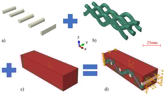 Principle of the assembly of the numerical model: (a) weft yarns, (b) warp yarns, (c) polymer matrix, (d) portion of [0/90] hemp/Elium composite with boundary conditions.