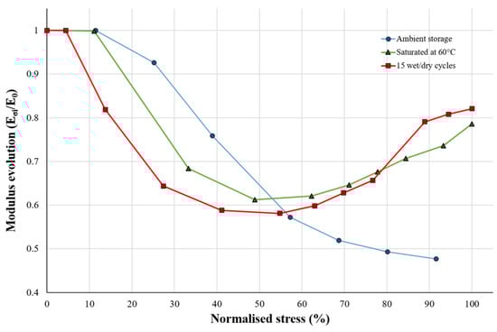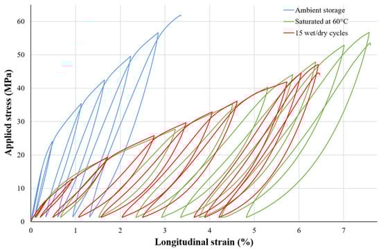 Repeated progressive loading tests were carried out to characterize the mechanical properties of [0/90]7 hemp/Elium samples for the “Ambient storage”, “Saturated at 60 °C” and “15 wet/dry cycles” conditionings (Figure 4). The different stress levels applied during the ex-situ repeated progressive loading tests were chosen so that the evolution of the secant modulus is described from the elastic domain to the failure of the sample.